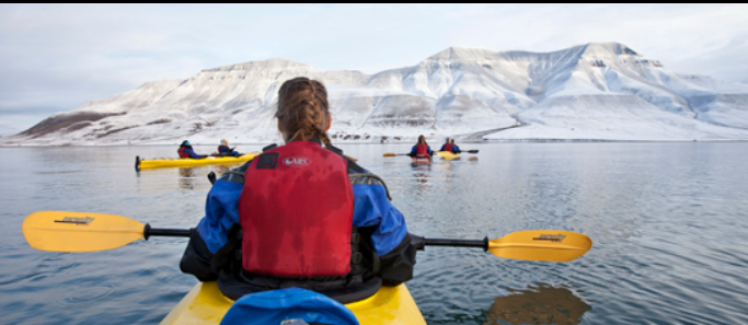 Je stapt in de kajak. Twee zitplaatsen, één ritme. Je peddelt laag over het water, dicht bij de kou. Het droogpak zit stug, maar houdt je warm. IJsschotsen drijven langzaam voorbij. De lucht is stil. De fjord ligt open. In de verte zie je de contouren van Adventdalen. Soms hoor je alleen het zachte klotsen van je peddel. Soms duikt er iets op. Een zeehond. Een korte glimp en dan weer niets.