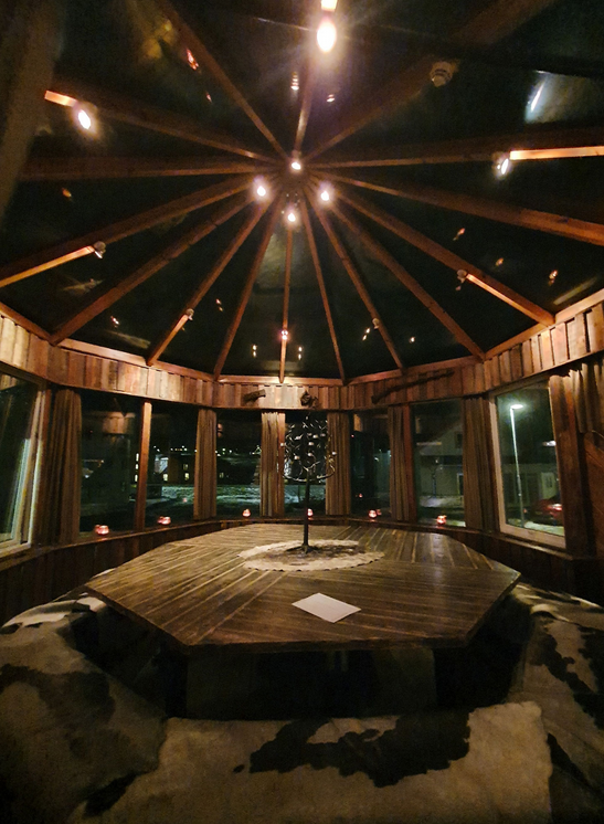 In dit stijlvolle restaurant, gevestigd in het Radisson Blu Hotel, wacht je een verrassend menu dat het beste van twee werelden combineert. Denk: Arctische vis, rendier of lam met een vleugje wasabi of kokos. Met het knapperende haardvuur op de achtergrond en een modern interieur is dit een plek waar comfort en verfijning samenkomen.